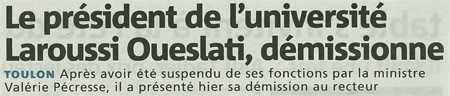 Le quotidien Régional Var matin a publié le 7 novembre 2009 un article intitulé : "Le président de l'université Laroussi Oueslati, démissionne".