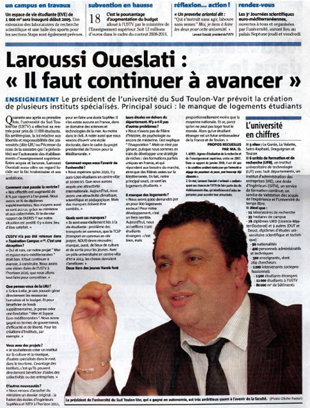 Le Quotidien régional "Var Matin" a publié le 07 novembre 2008 une interview de Monsieur Laroussi OUESLATI intitulée : "Laroussi Oueslati : il faut continuer à avancer".